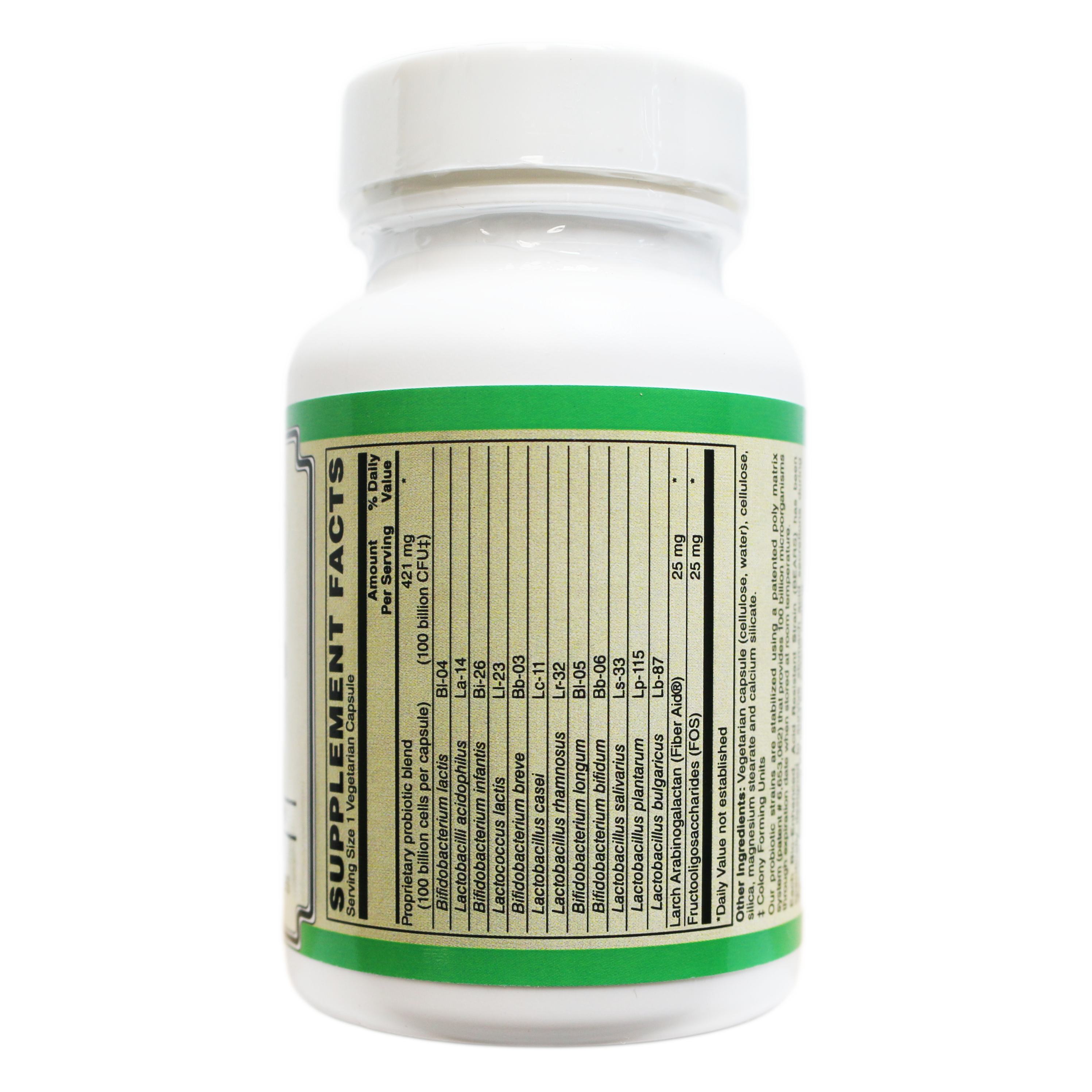 Each ultra-high potency vegetarian capsule contains 421 mg of a Proprietary Probiotic Blend (delivering 100 Billion viable cells per serving), comprised of 12 key strains: Lactobacillus acidophilus (La-14), Bifidobacterium lactis (Bl-04), Bifidobacterium infantis (Bi-26), Lactococcus lactis (Ll-23), Bifidobacterium breve (Bb-03), Lactobacillus casei (Lc-11), Lactobacillus rhamnosus (Lr-32), Bifidobacterium longum (Bl-05), Bifidobacterium bifidum (Bb-06), Lactobacillus salivarius (Ls-33), Lactobacillus plantarum (Lp-115), and Lactobacillus bulgaricus (Lb-87).