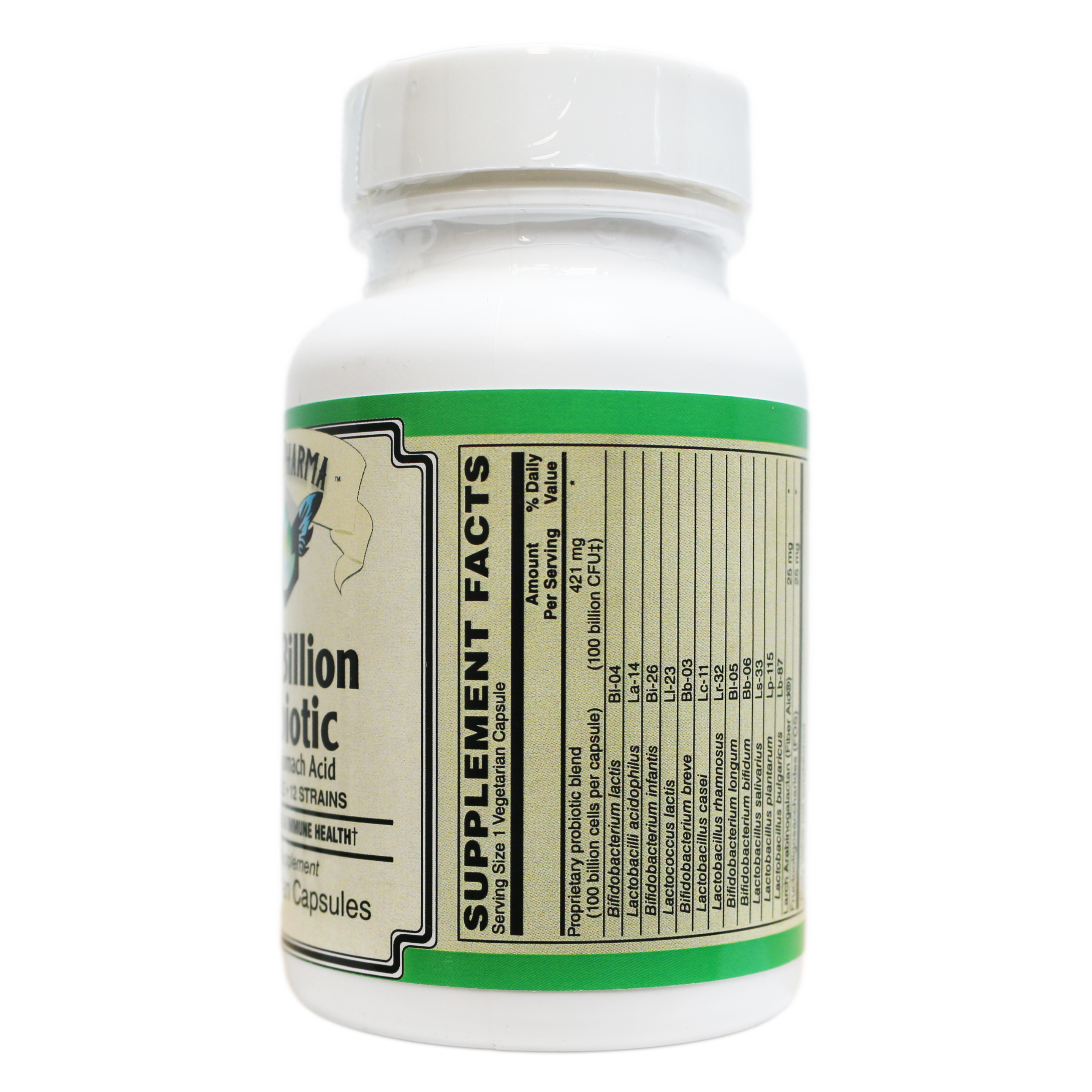 Each ultra-high potency vegetarian capsule contains 421 mg of a Proprietary Probiotic Blend (delivering 100 Billion viable cells per serving), comprised of 12 key strains: Lactobacillus acidophilus (La-14), Bifidobacterium lactis (Bl-04), Bifidobacterium infantis (Bi-26), Lactococcus lactis (Ll-23), Bifidobacterium breve (Bb-03), Lactobacillus casei (Lc-11), Lactobacillus rhamnosus (Lr-32), Bifidobacterium longum (Bl-05), Bifidobacterium bifidum (Bb-06), Lactobacillus salivarius (Ls-33), Lactobacillus plantarum (Lp-115), and Lactobacillus bulgaricus (Lb-87).