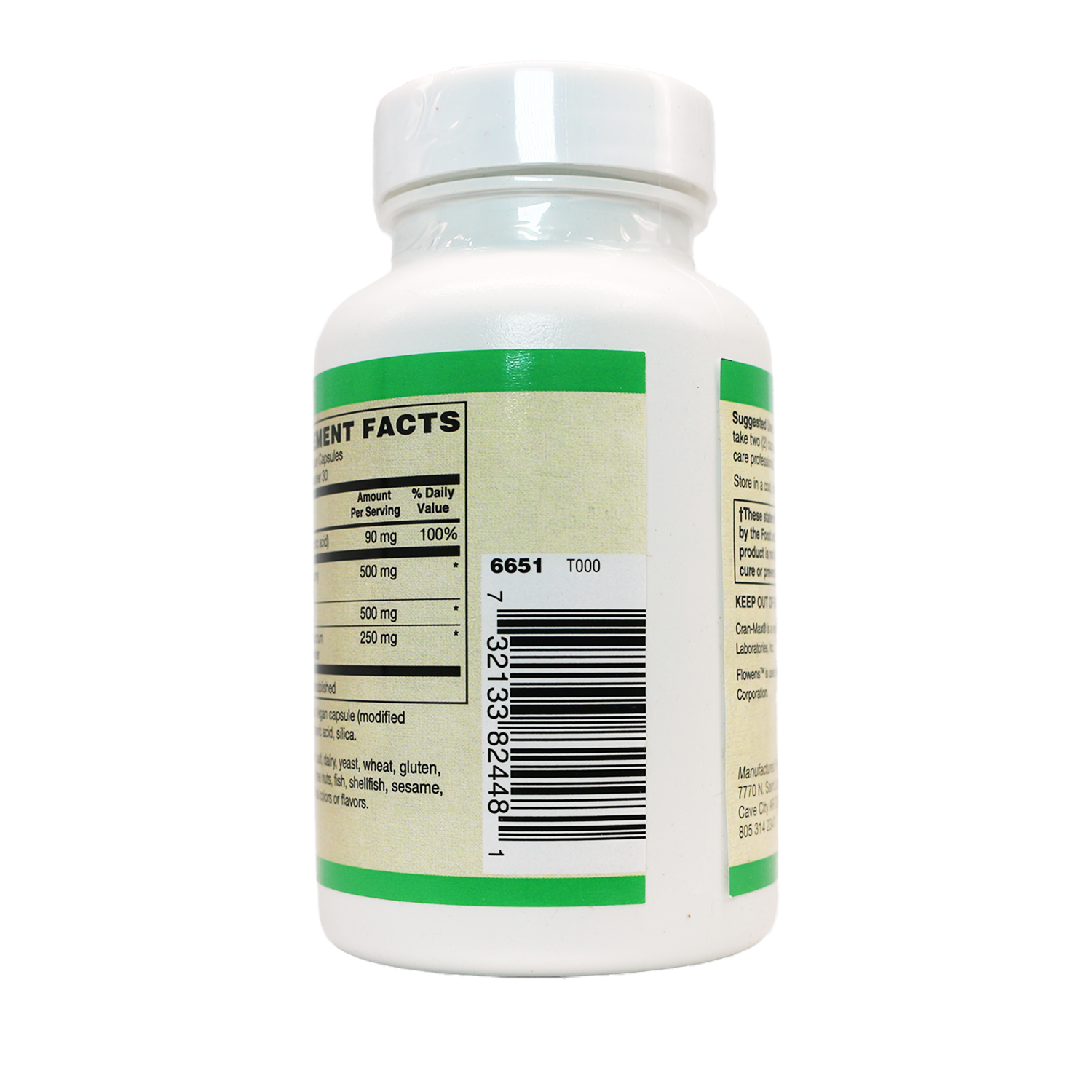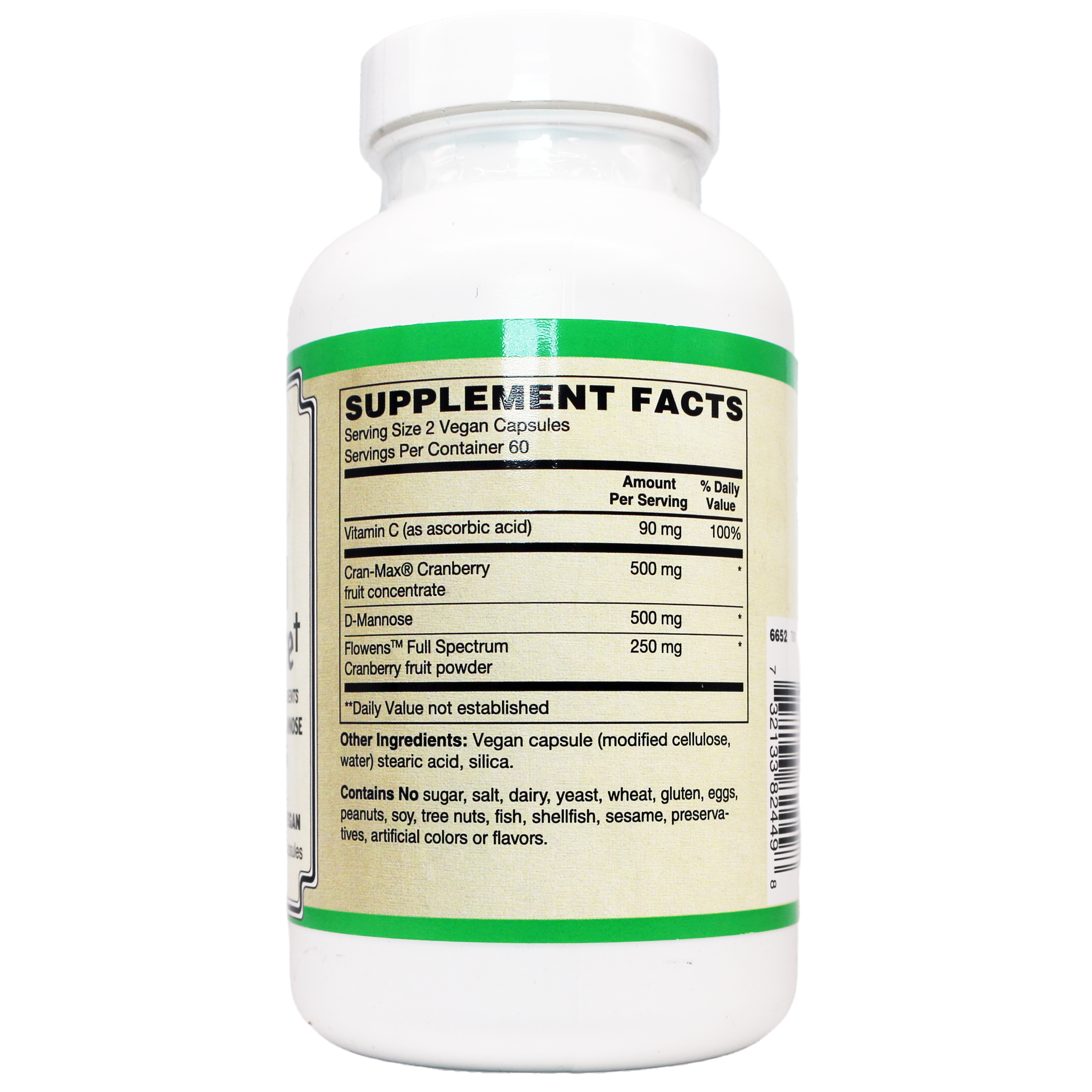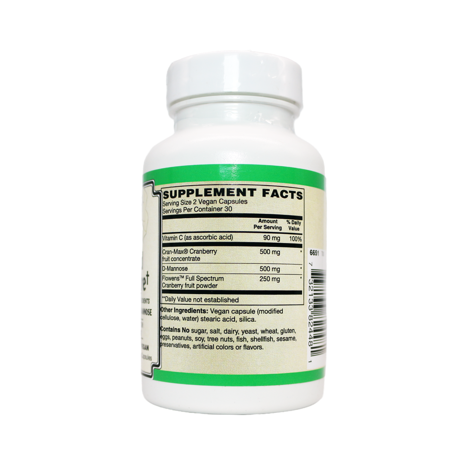 Ingredients: Vitamin C (90mg), Cran-Max® Cranberry Fruit Concentrate (500mg), D-Mannose (500mg), Flowens™ Full Spectrum Cranberry Fruit Powder (250mg).