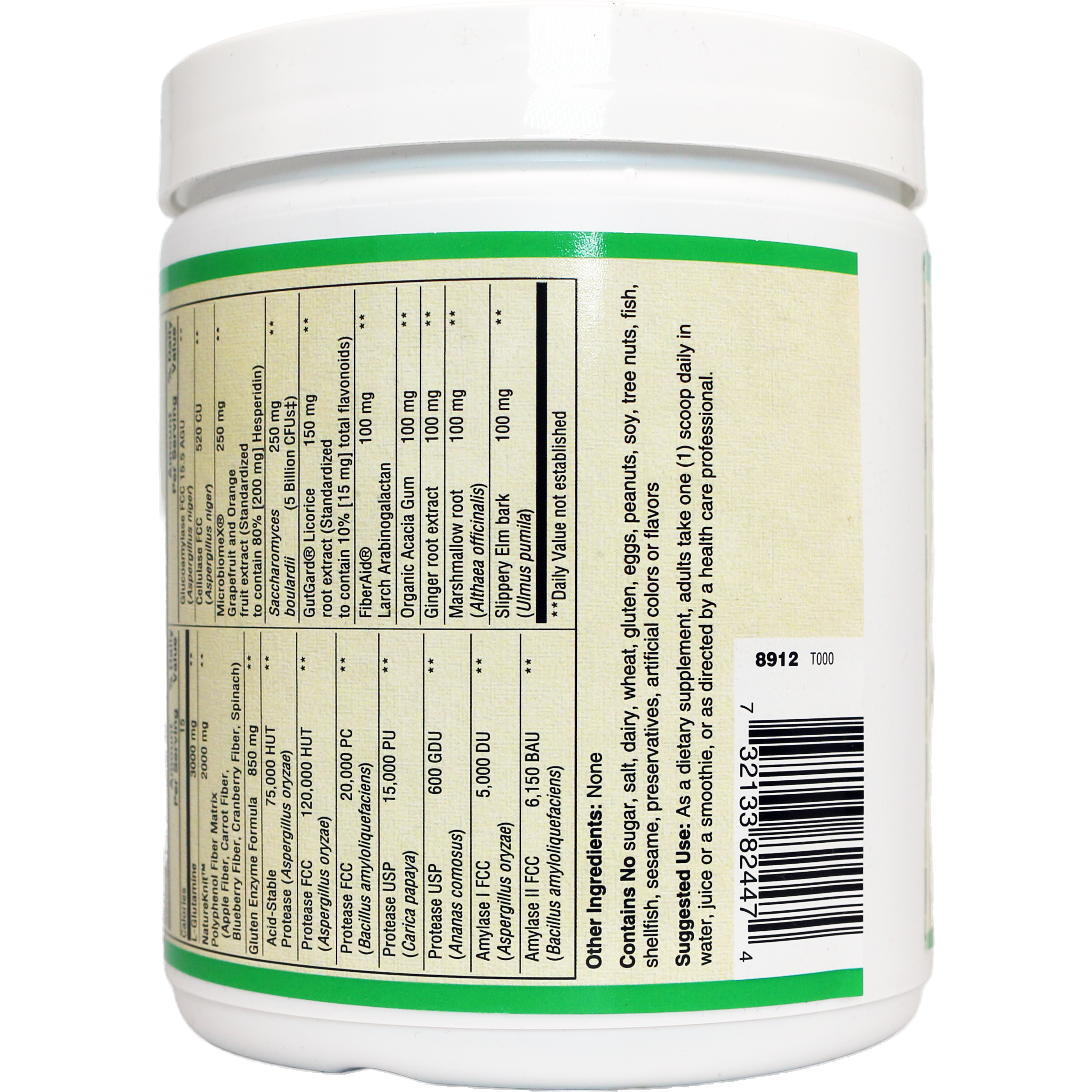 Ingredients: Each serving contains: L-Glutamine 3000 mg, NatureKnit™ (Fiber-Bound Polyphenols) 2000 mg, Gluten Enzyme Formula 850 mg, MicrobiomeX® (Grapefruit and Orange Fruit Extract) 250 mg, Lynside® PRO SCB (Saccharomyces boulardii) 250 mg, GutGard® (Standardized Licorice Root Extract) 150 mg, FiberAid® (Larch Arabinogalactan) 100 mg, Organic Acacia Gum 100 mg, Ginger Root Extract 100 mg, Marshmallow Root (Althaea officinalis) 100 mg, and Slippery Elm Bark (Ulmus pumila) 100 mg.