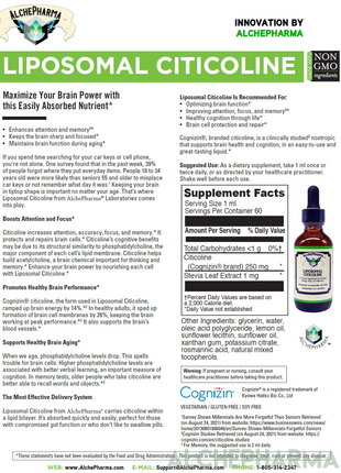 Citicoline increases attention, accuracy, focus, and memory.* It protects and repairs brain cells.* Citicoline’s cognitive benefits may be due to its structural similarity to phosphatidylcholine, the major component of each cell’s lipid membrane. Citicoline helps build acetylcholine, a brain chemical important for thinking and memory.* Enhance your brainpower by nourishing each cell with Liposomal Citicoline.*