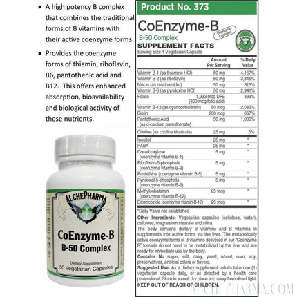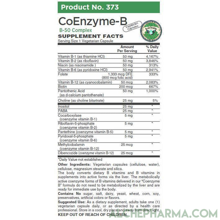 B-vitamins are required for numerous biochemical and physiological processes including the metabolism of macronutrients (carbohydrates, fats and proteins) to make energy, support of healthy nervous system function and for cardiovascular function.* Typically B-vitamins are used as needed and any excess is excreted. This makes it very important to consume these essential nutrients on a daily basis. Once B-vitamins are consumed they cannot perform their necessary functions until they are converted into their active coenzyme forms. Aging, chronic disease and other factors may limit one’s ability to convert B-vitamins into their coenzyme forms. Our Coenzyme-B50 Complex provides the active coenzyme forms of several essential B-vitamins. This bypasses the need for conversion, improves absorption, bioavailability and function.*