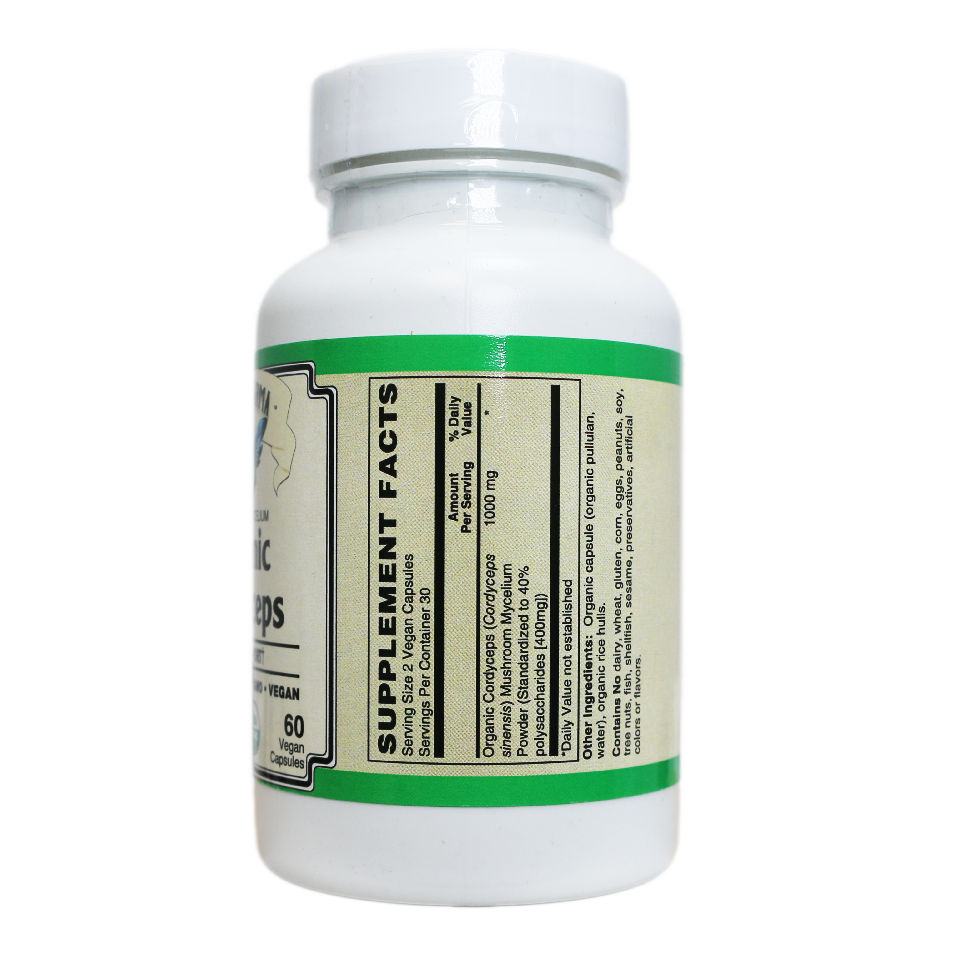 Active Ingredient: Organic Cordyceps (Cordyceps sinensis) Mushroom Mycelium Powder (Standardized to 40% polysaccharides [400mg]).