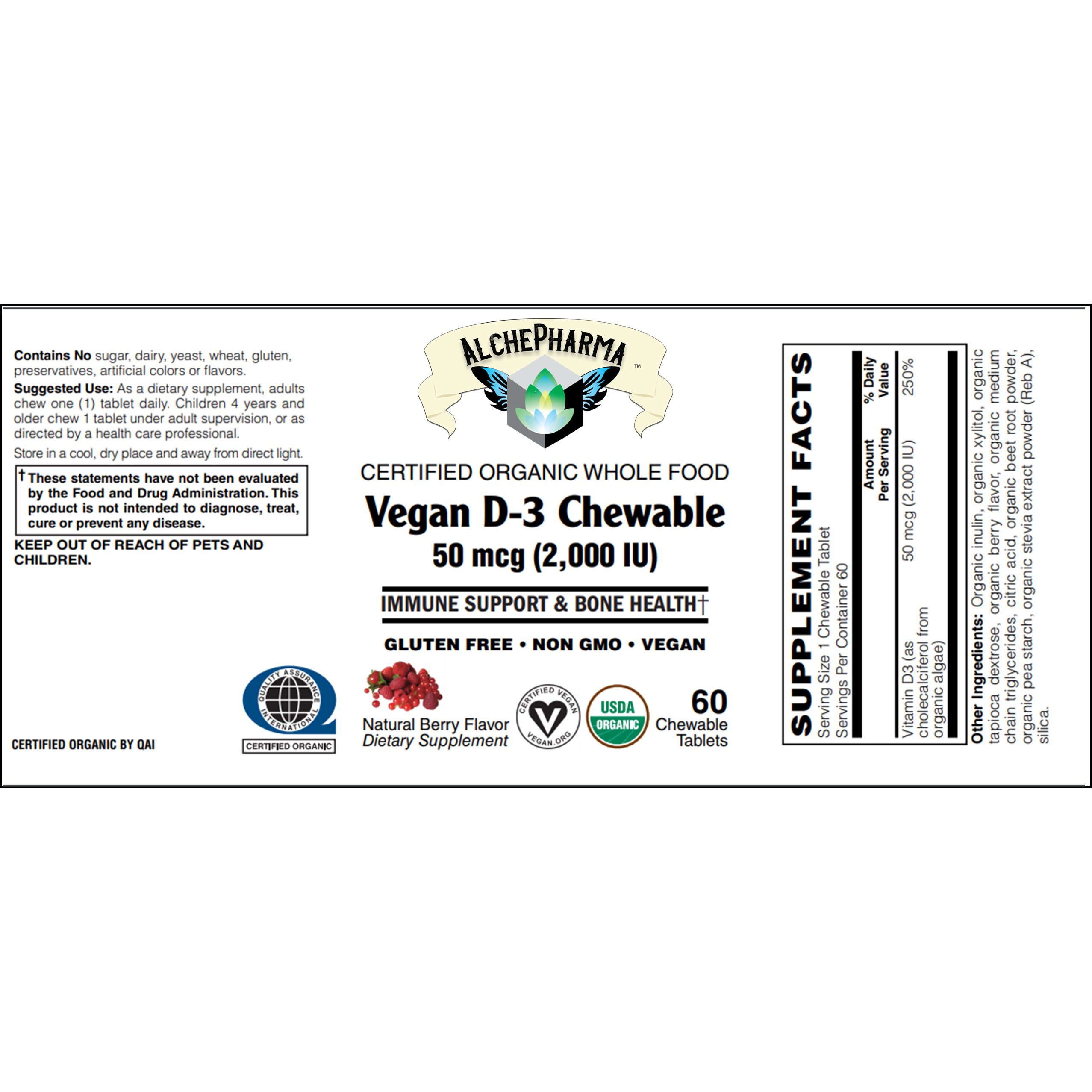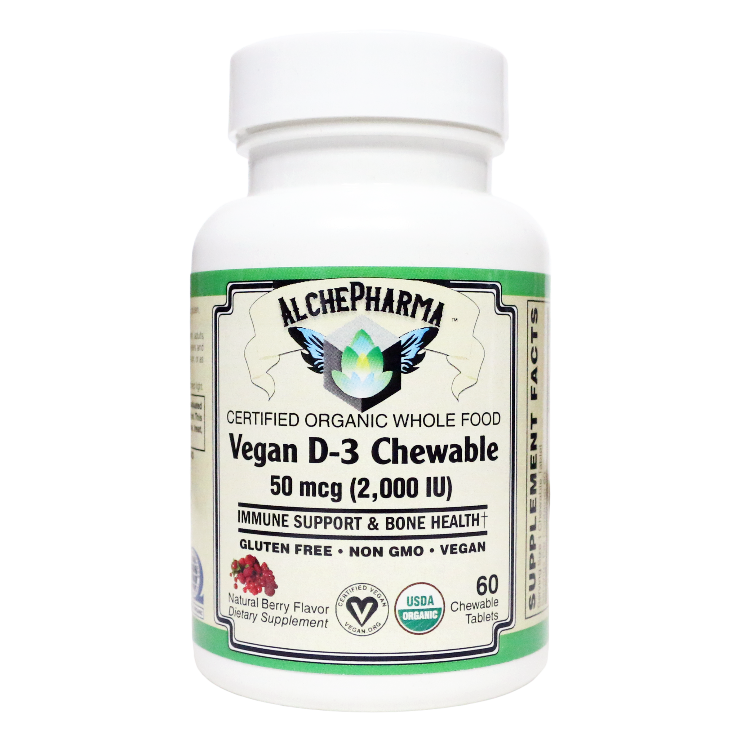 This revolutionary active, VegD3®, is Vitamin D3 (cholecalciferol) of 100% non-GMO plant origin. That makes it universally acceptable, unlike animal-derived Vitamin D3 such as lanolin-origin. VegD3 is approved by the Vegan Society and is also Kosher and Halal certified. VegD3® was tested extensively to prove that it is chemically identical to cholecalciferol of animal origin. This takes away any uncertainty about absorption or efficacy (as it is literally clean, pure cholecalciferol), it meets all regulatory requirements. VegD3® is extensively stability tested to ensure that it offers a shelf-life that is at least the same as lanolin-origin D3. Consumer demand for Organic and Plant-based supplements grows every year and has for the last thirty years. With all the delivery options available, flavored delivery systems are the fastest-growing segment. Our Chewable Certified Organic Whole Food Vitamin D3 provides a vegan & chewable form of Vitamin D3 (natural algae food form) at a highly efficacious dose.