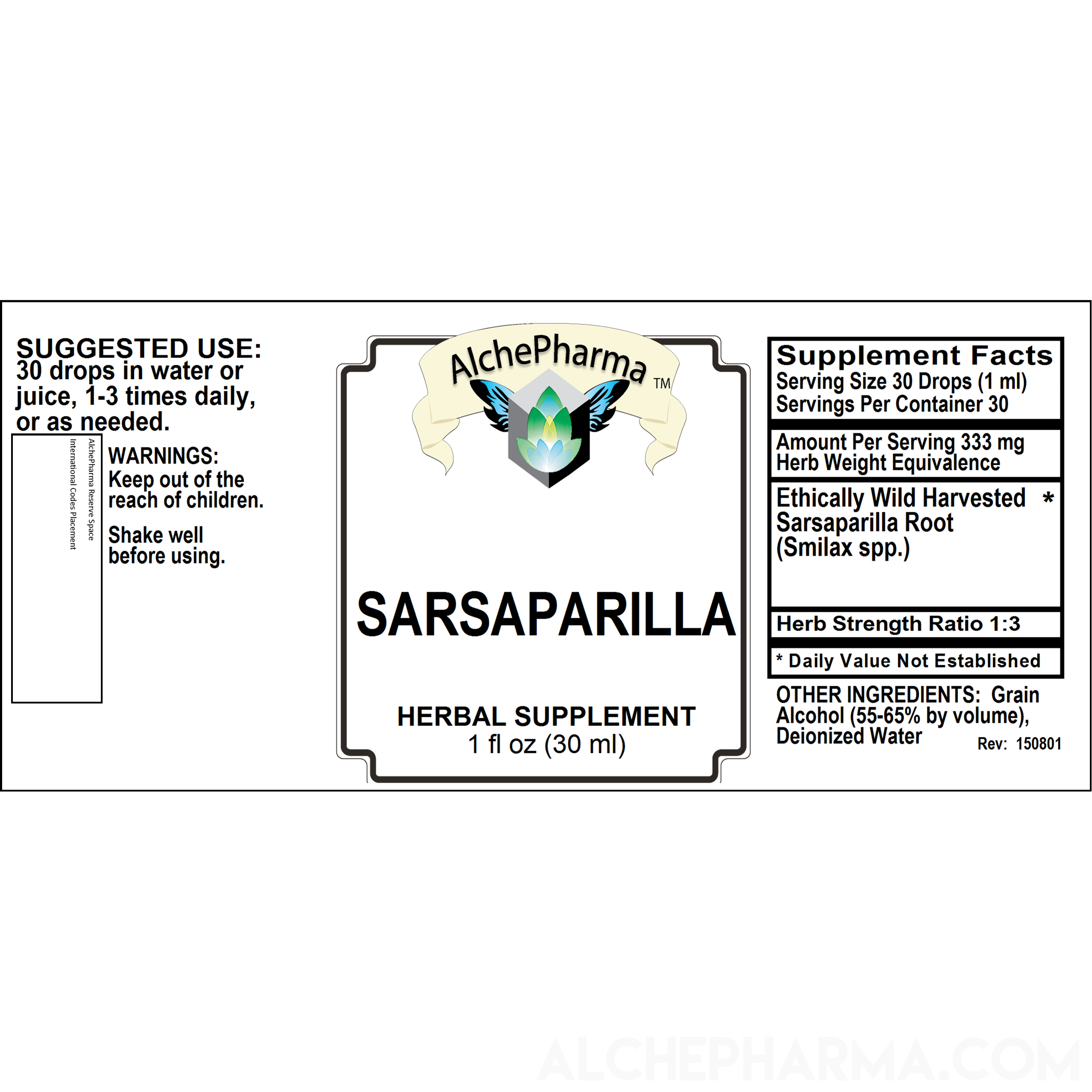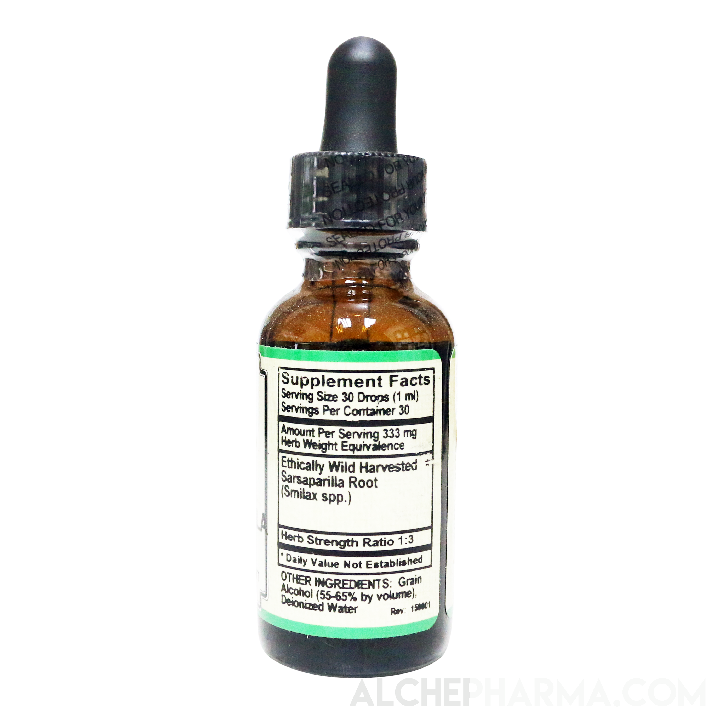 AlchePharma's Sarsaparilla Root Tincture liquid tincture utilizes wild-harvested Sarsaparilla Root in an herb strength ratio of 1:3. This yields an Herb Weight Equivalence of 300 mg. per 1 ml.