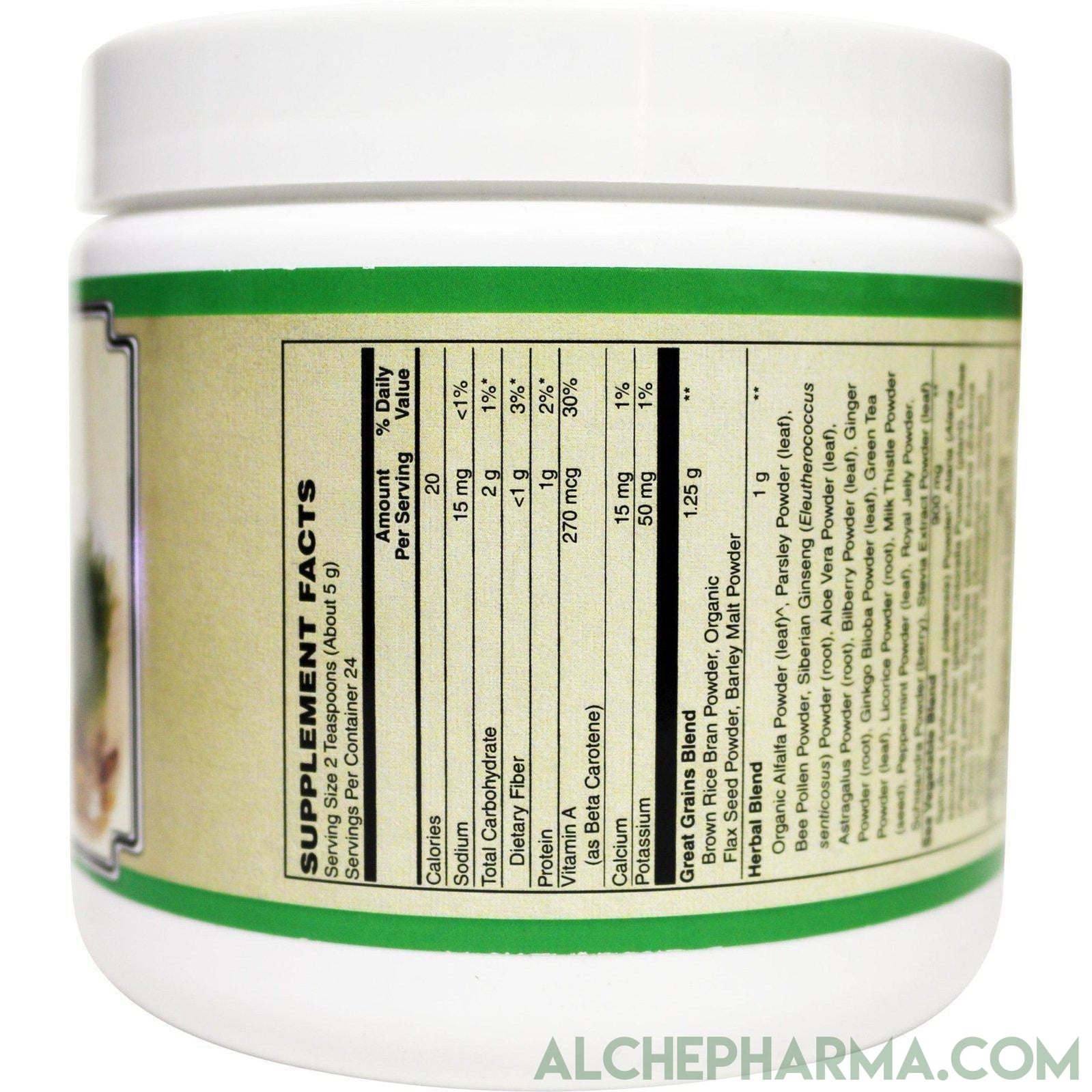 UltraGreens™ (Super Greens) contains trademarked Earthrise® brand Spirulina, Pines International® brand of Cereal Grasses and NutraFlora® FOS.