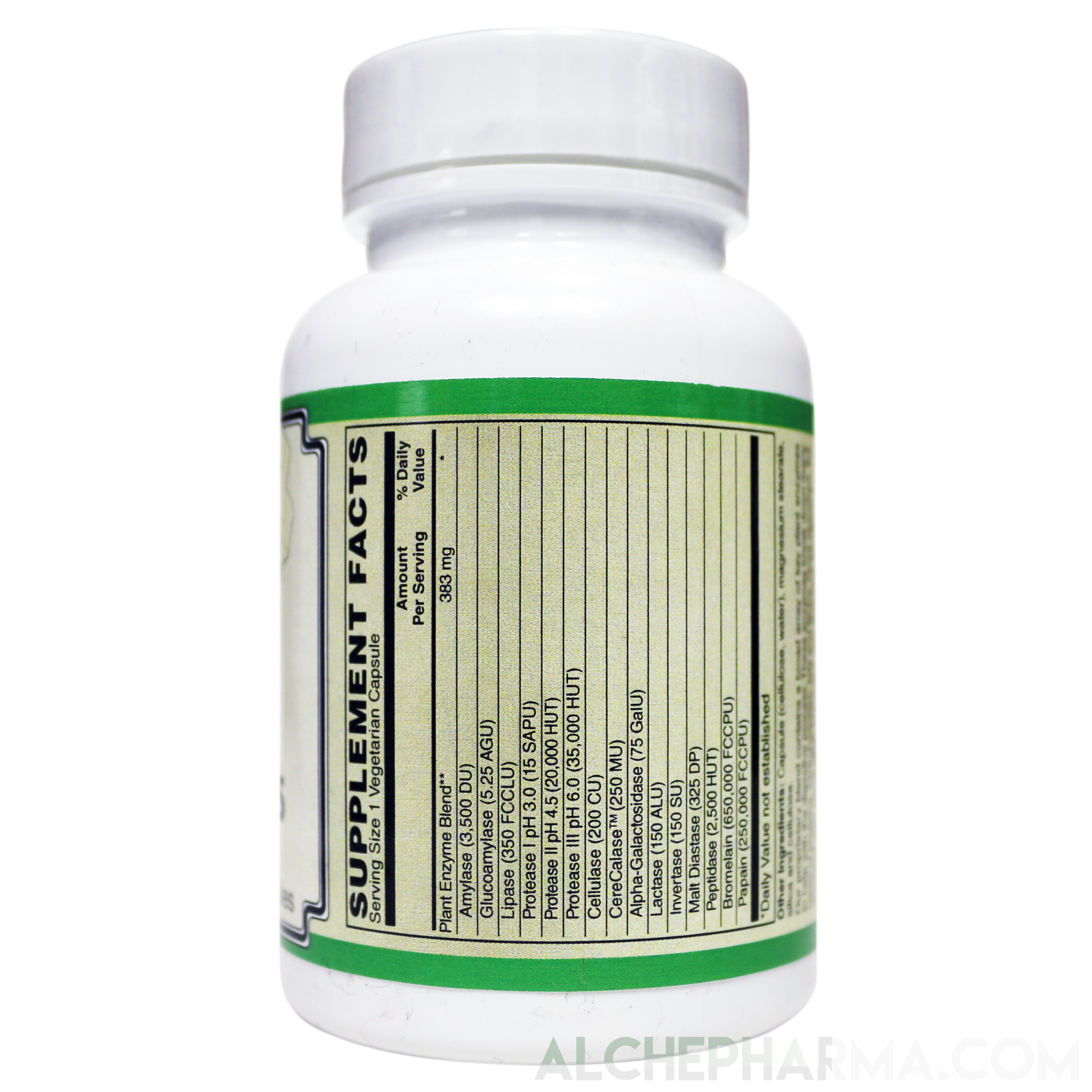 Ingredient List: Plant Enzyme Blend** 383 mg * Amylase (3,500 DU) Glucoamylase (5.25 AGU) Lipase (350 FCCLU) Protease I pH 3.0 (15 SAPU) Protease II pH 4.5 (20,000 HUT) Protease III pH 6.0 (35,000 HUT) Cellulase (200 CU) CereCalase™ (250 MU) Alpha-Galactosidase (75 GaIU) Lactase (150 ALU) Invertase (150 SU) Malt Diastase (325 DP) Peptidase (2,500 HUT) Bromelain (650,000 FCCPU) Papain (250,000 FCCPU), Capsule (cellulose, water), magnesium stearate, silica and cellulose